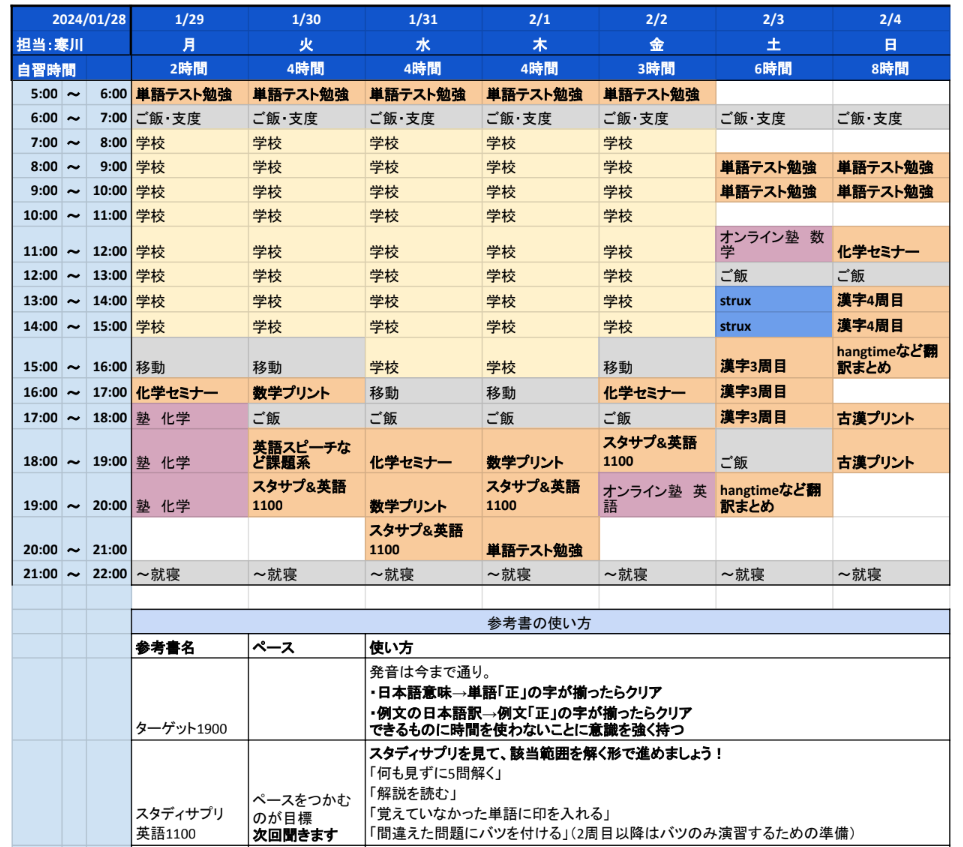 学習塾STRUXに高1から通って医学部に合格した生徒さんの週間計画がこちらです。