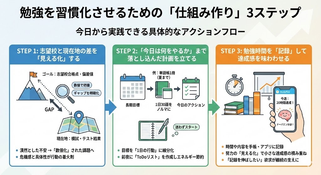 勉強を習慣化させるための「仕組み作り」3ステップは以下の通りです。